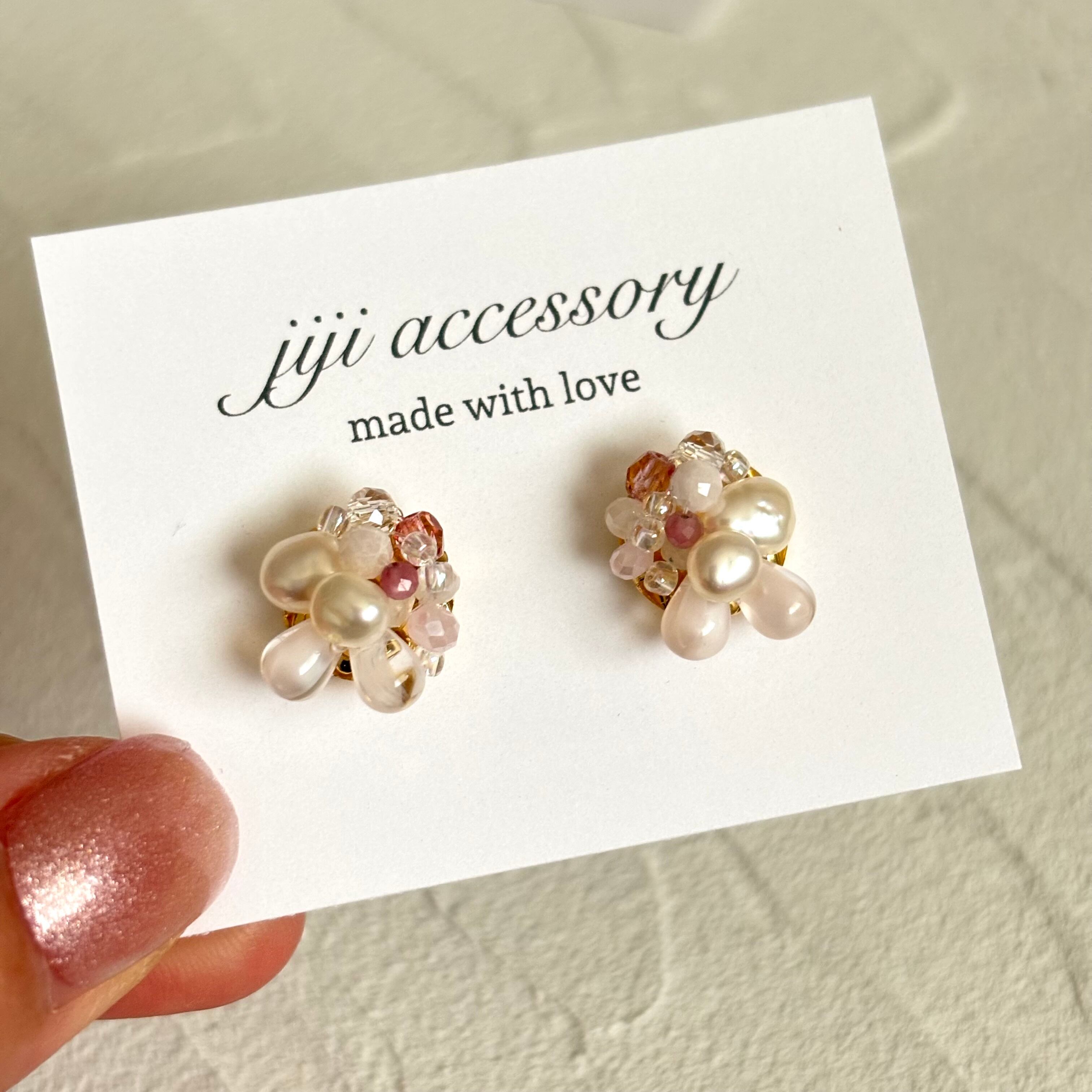 ほのかにピンクがかった乳白色の雫型ガラスドロップがふたつ並んでいる姿は、