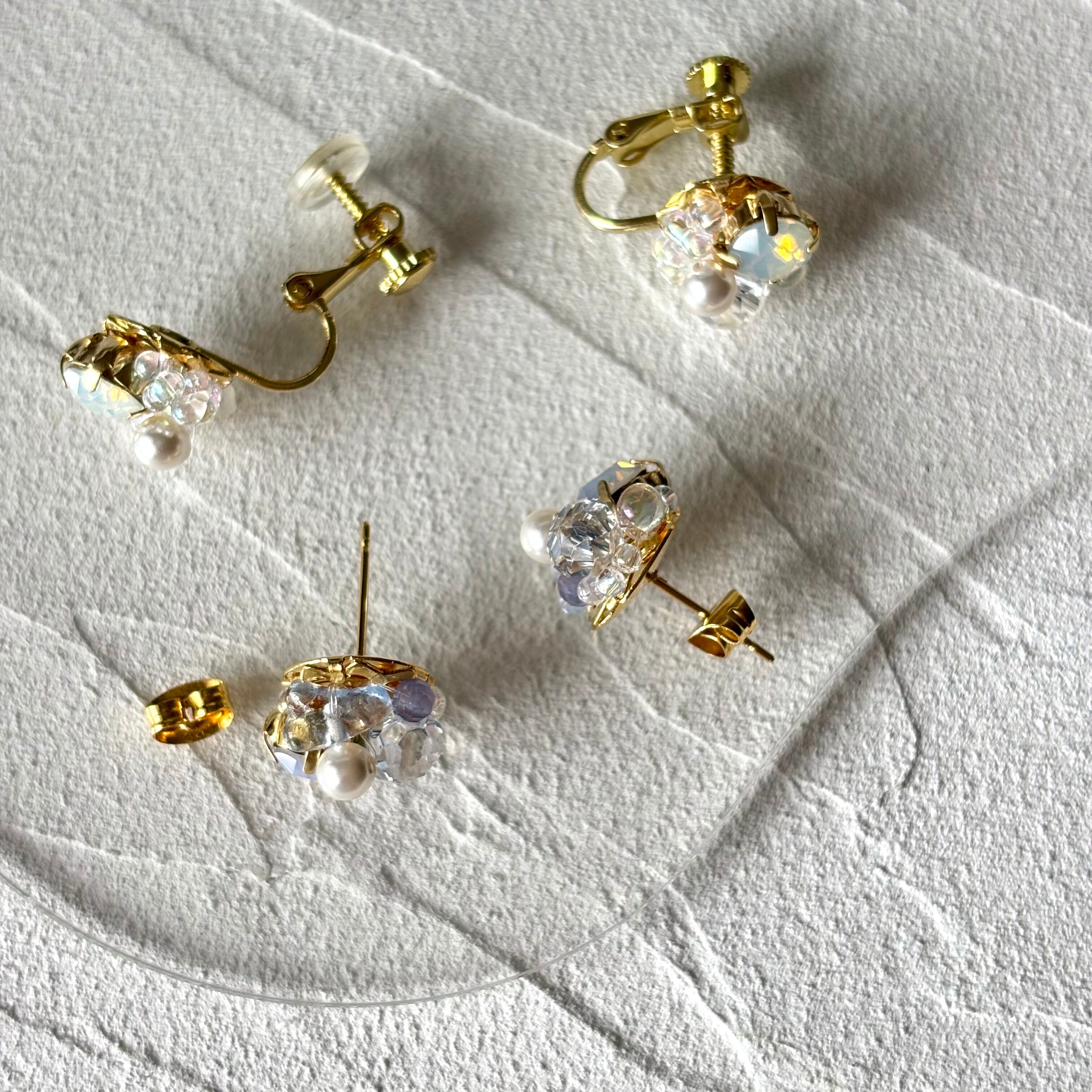 オパール調のクリスタルを使ってさまざまなビーズを組み合わせて編んだピアス/イヤリング
