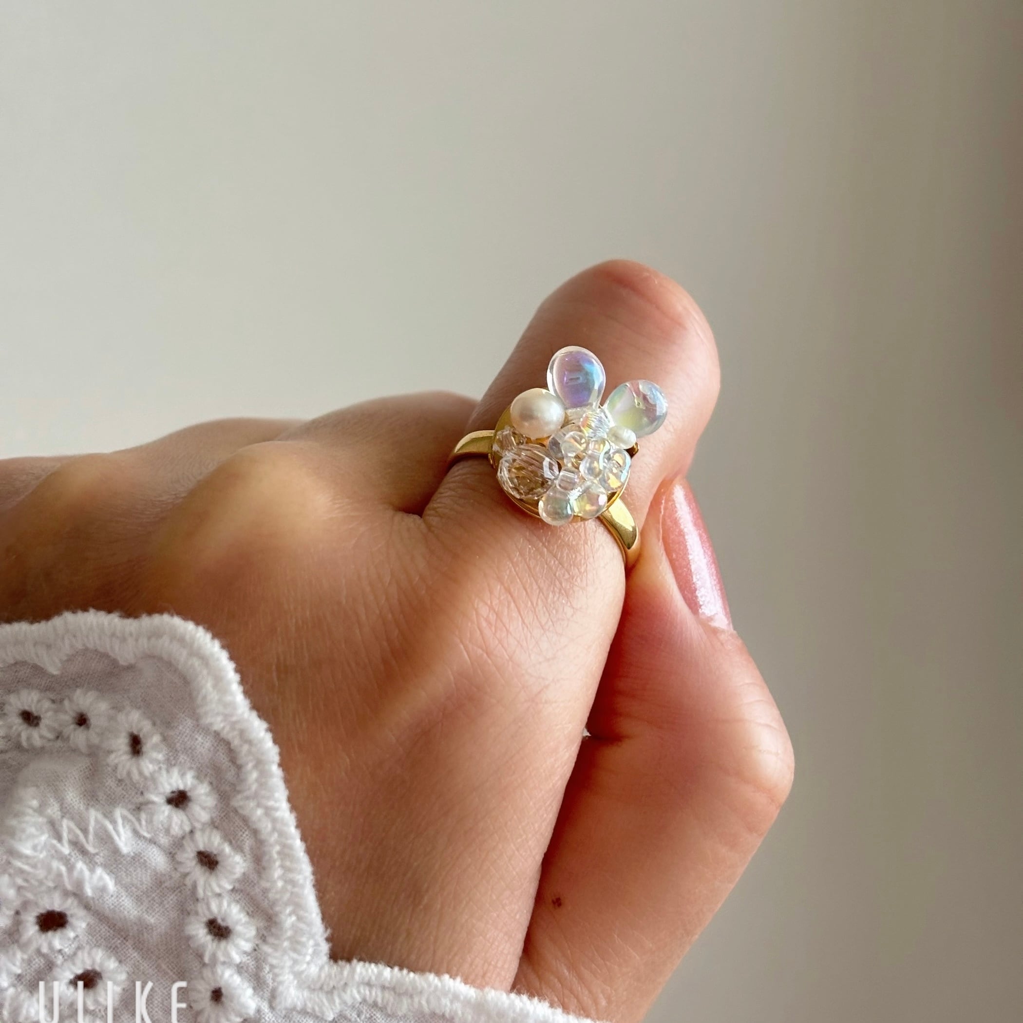 ドロップガラスをメインに淡水パールやビーズを編んだリングです。