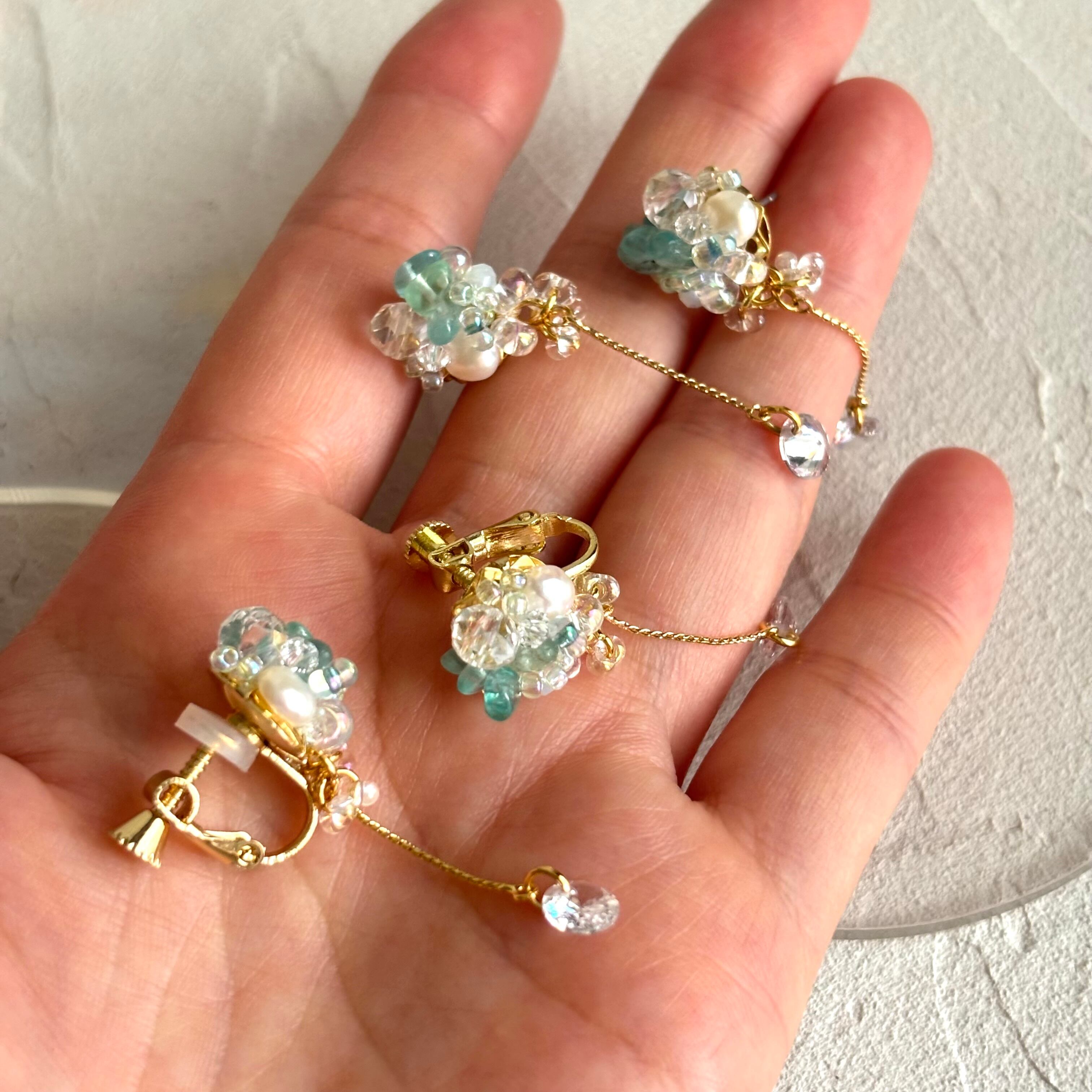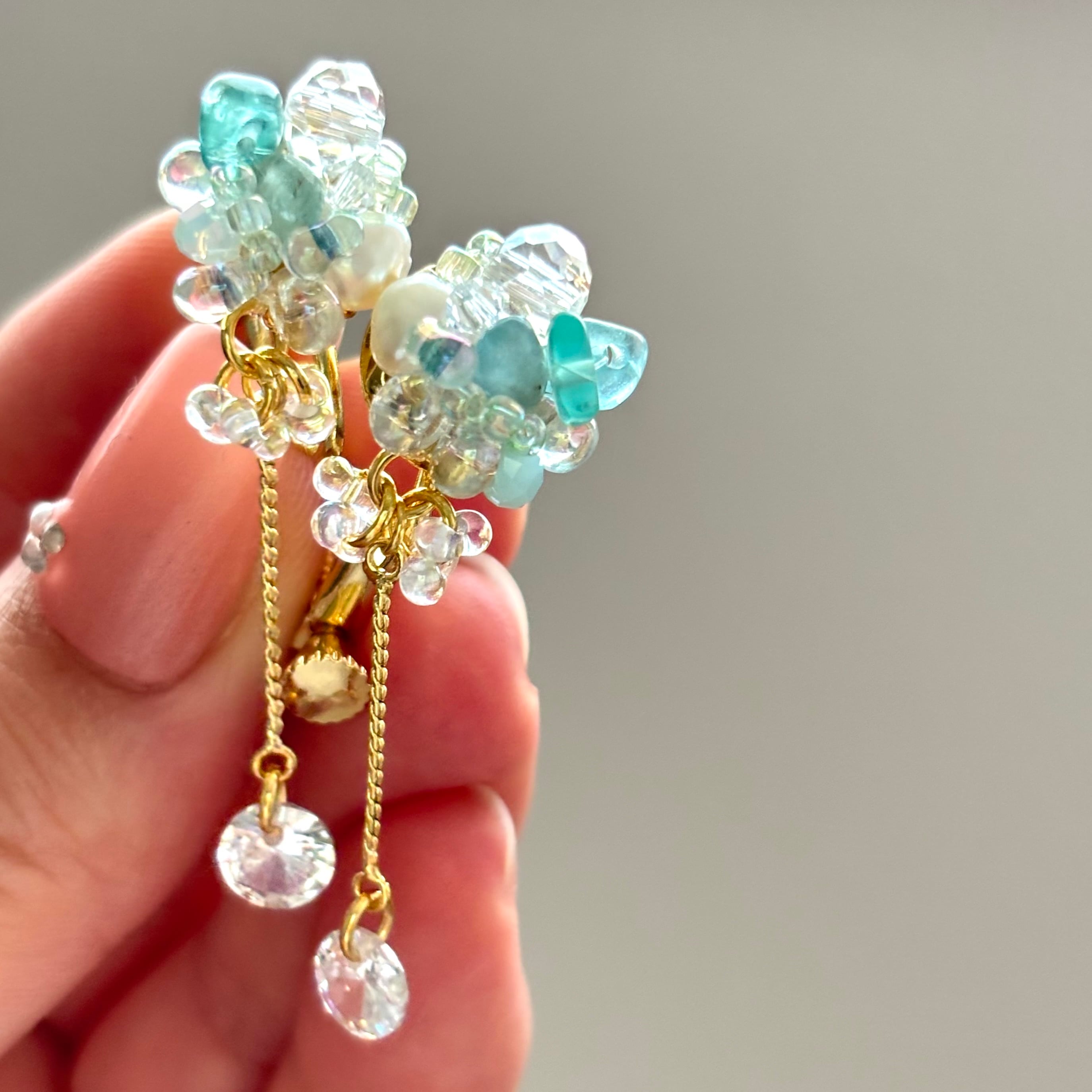 天然石と淡水パール、ガラスビーズをギュッと編んだ揺れるジルコニアのピアス/イヤリング