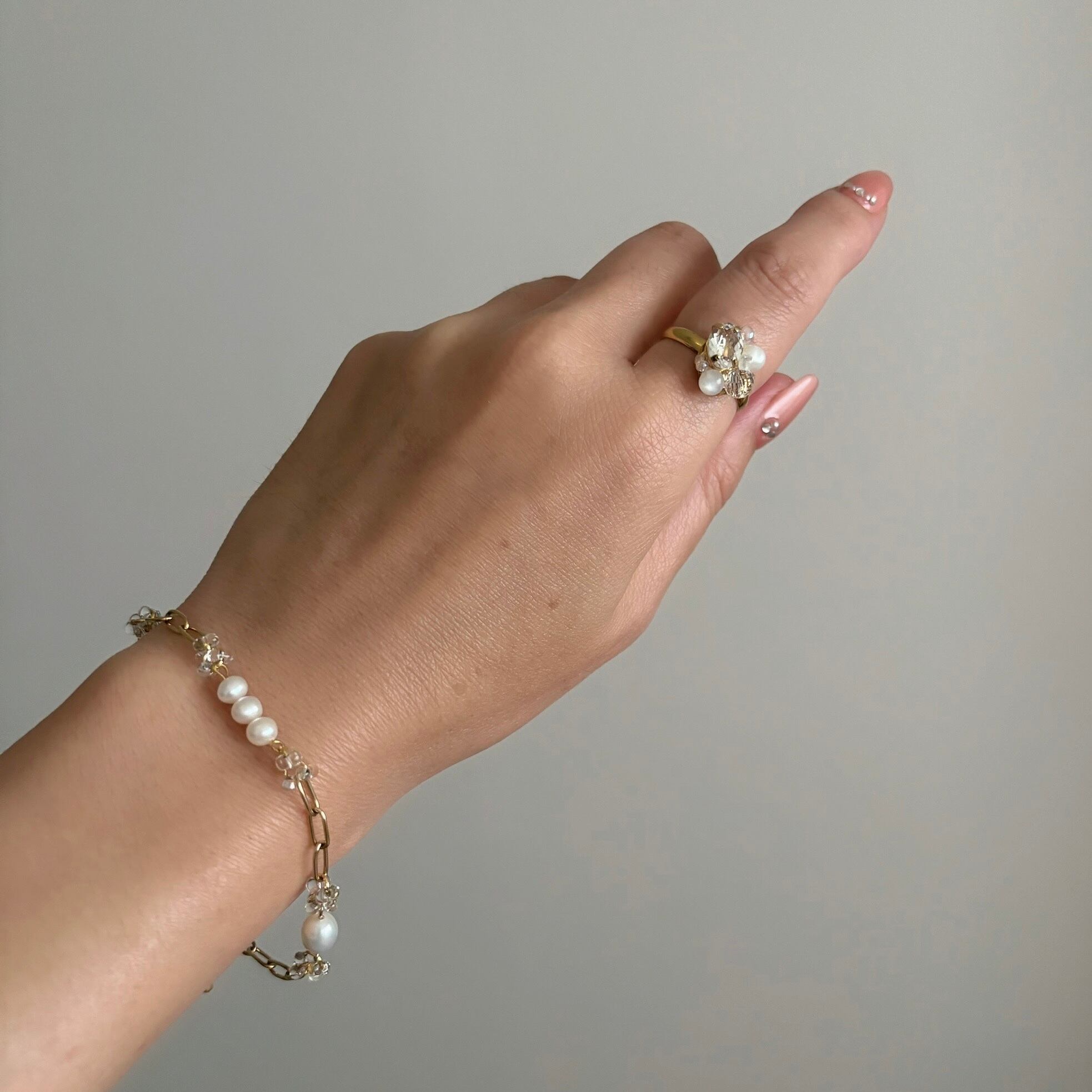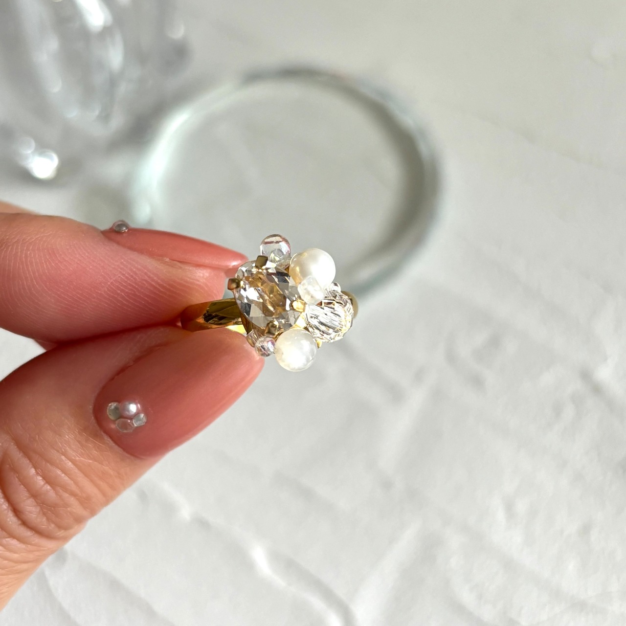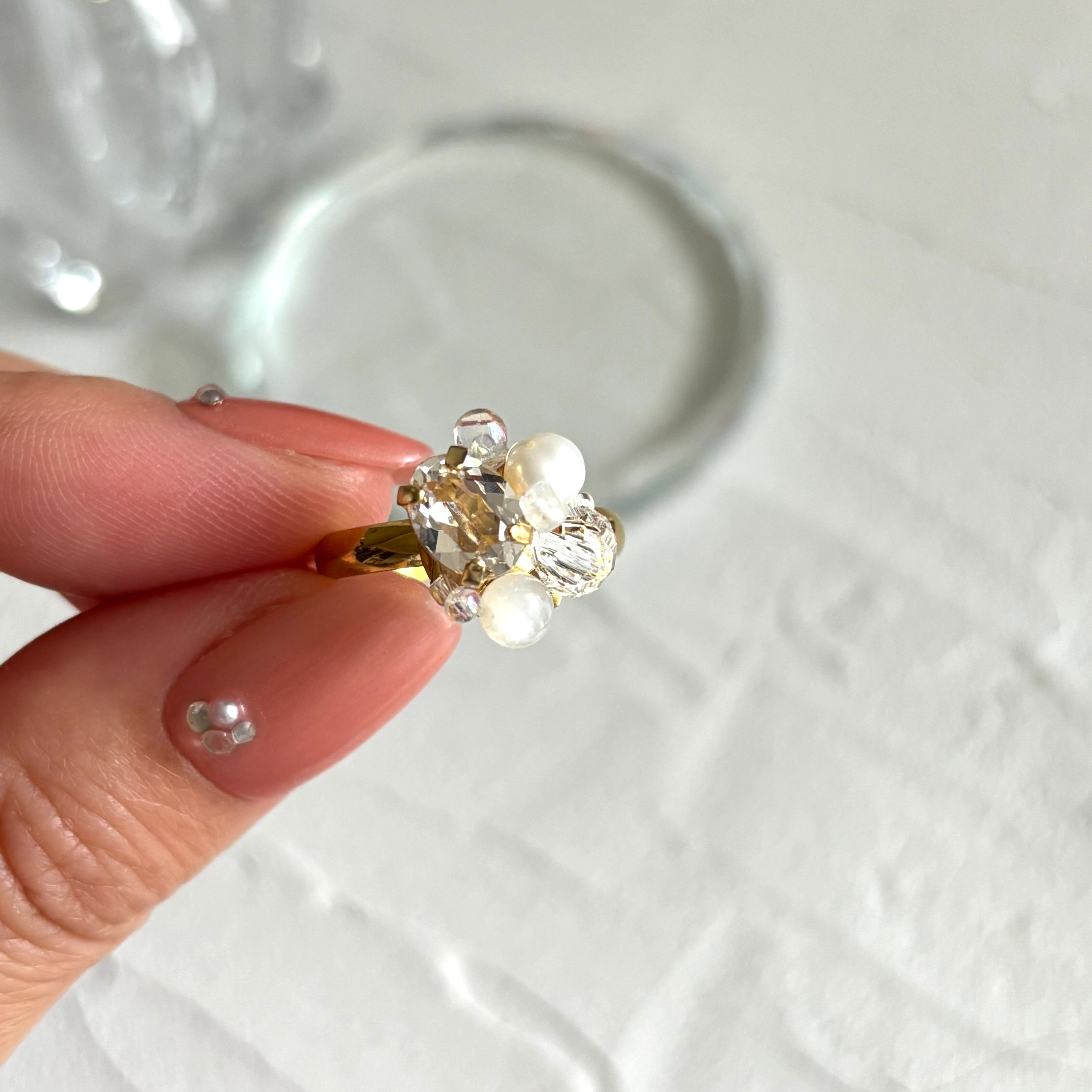 クリスタルとホワイトムーンストーン、淡水パールが寄り添うように並ぶ繊細で透明感あふれるリング。