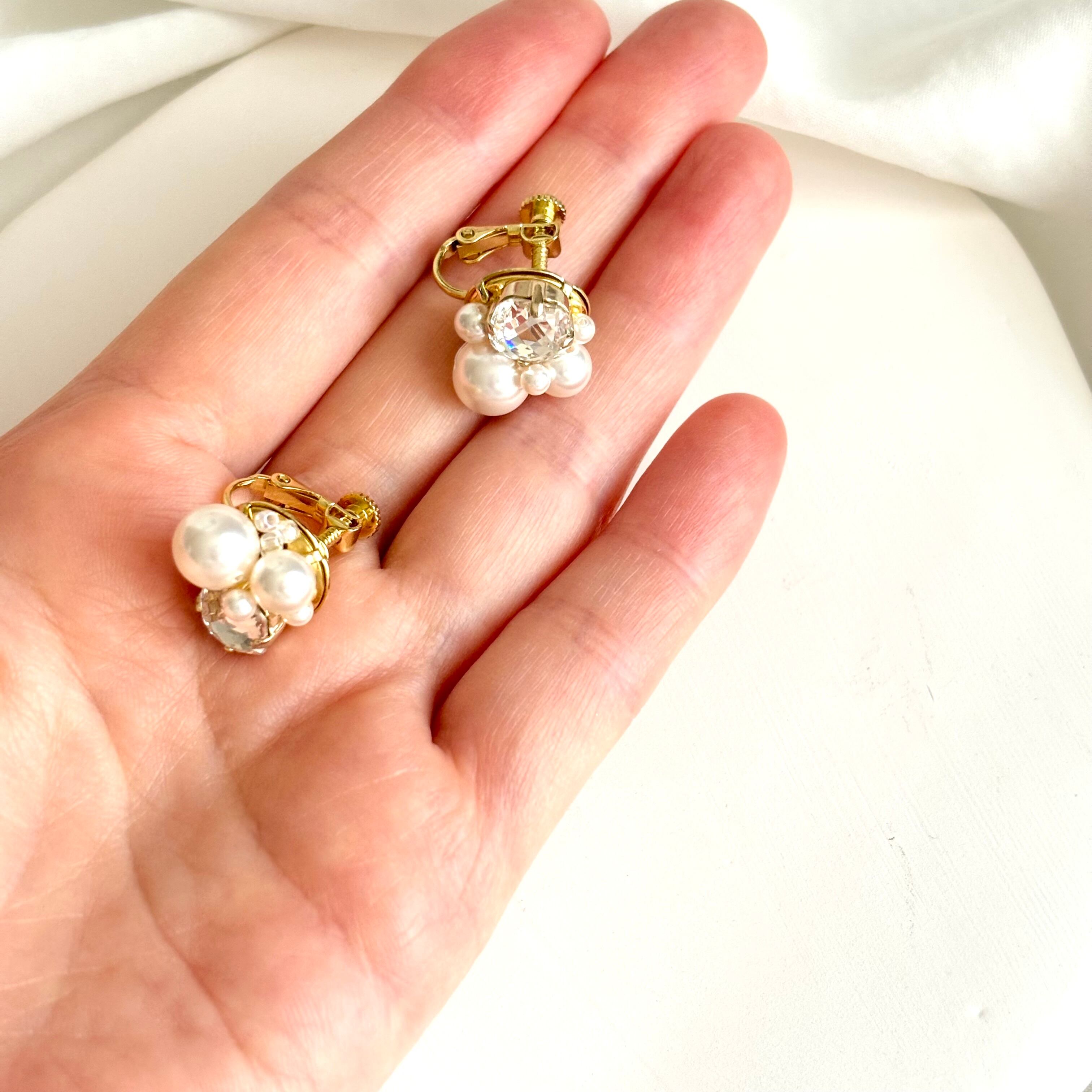 クリスタルとパールを編み込んだ存在感あるピアス/イヤリングです。