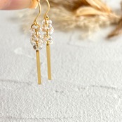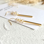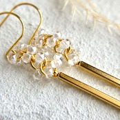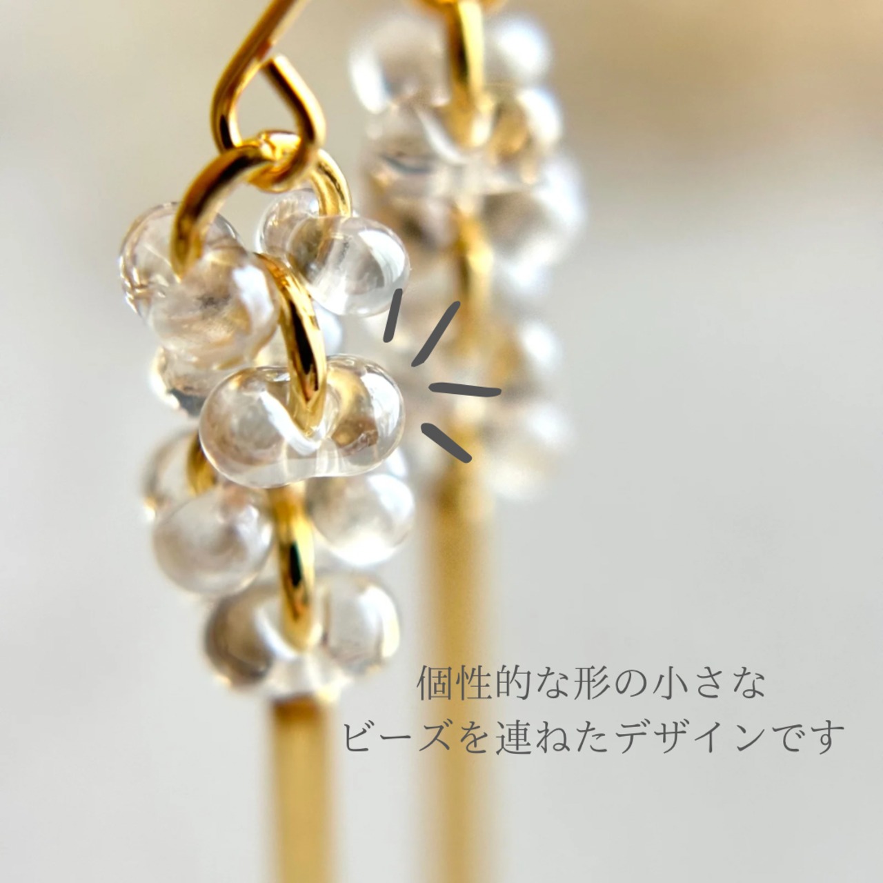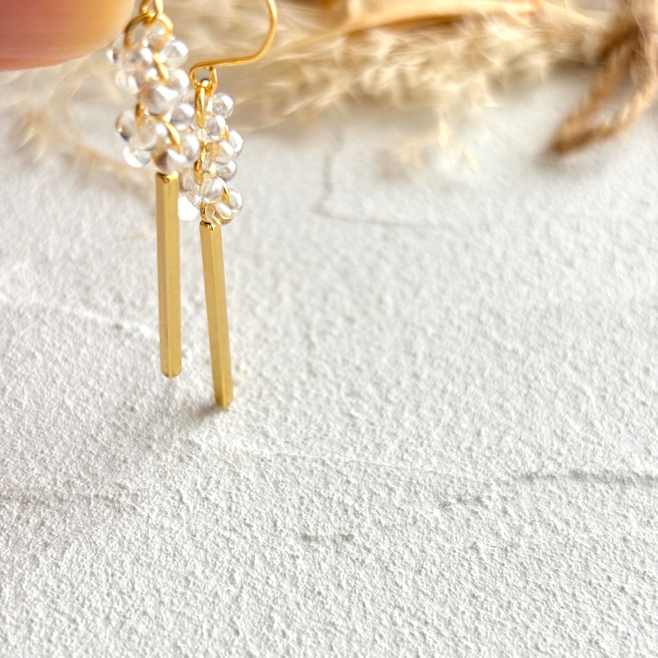 個性的な形の小さなクリアビーズを連ね、ゴールドバーを揺らしたシンプルだけどデザイン性のある