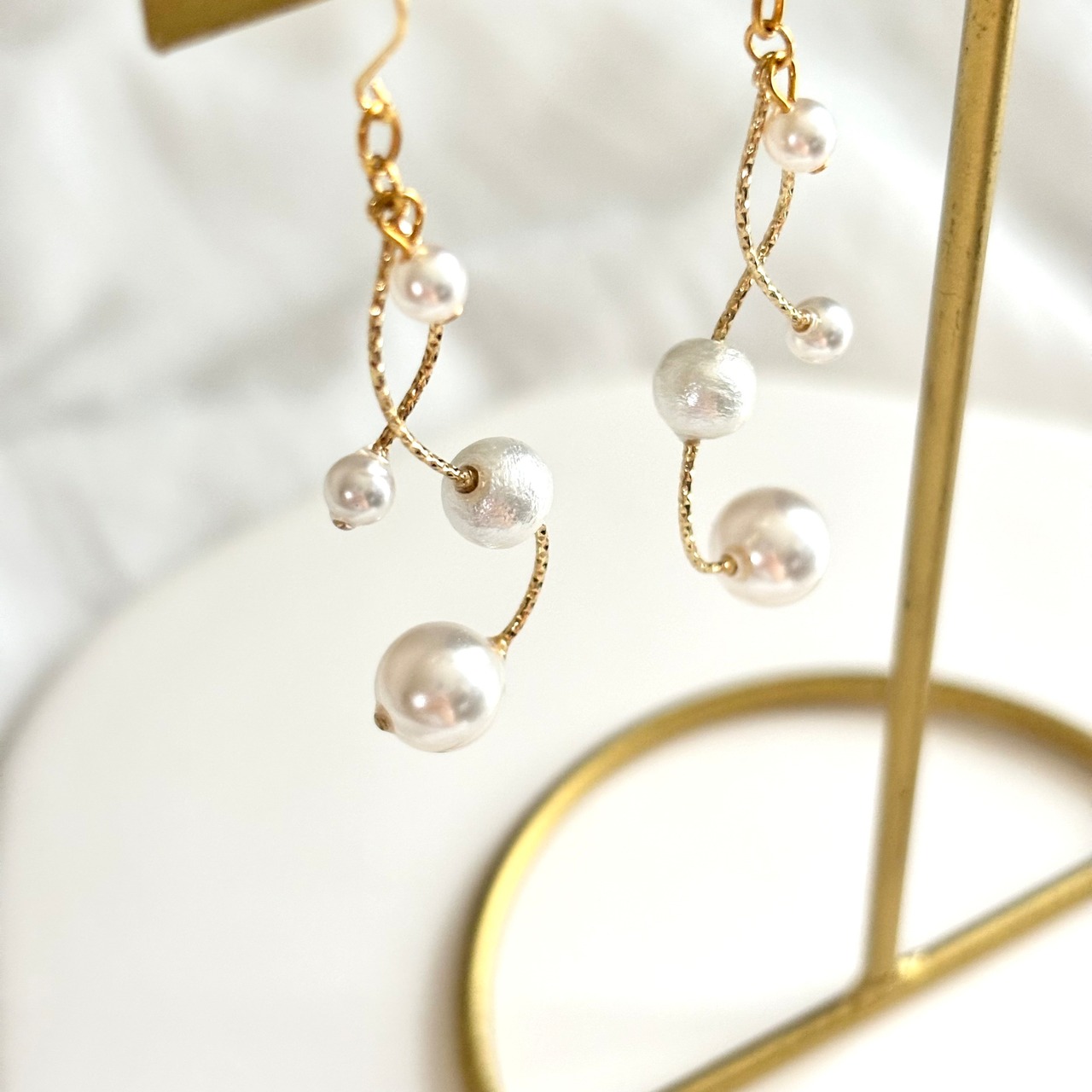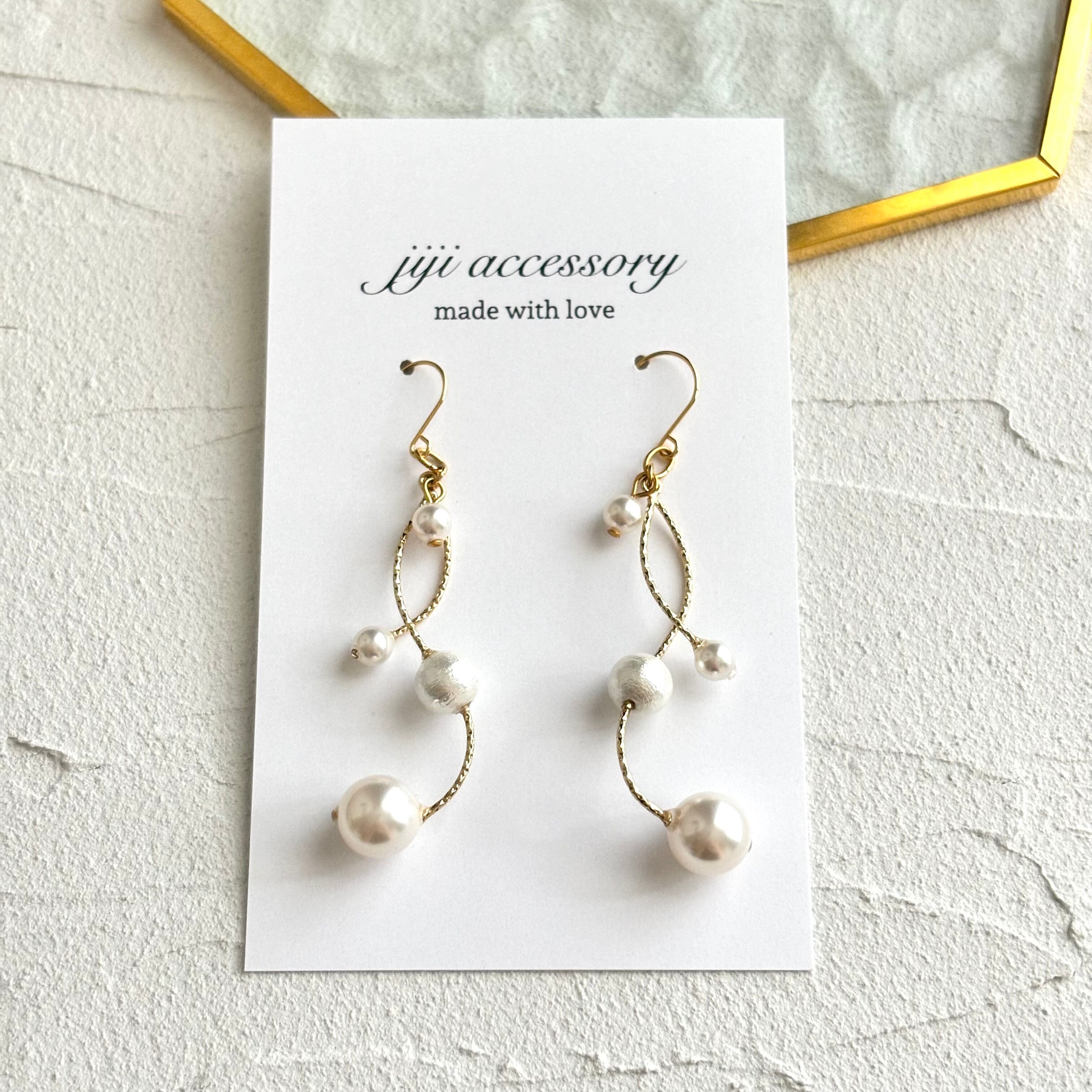 大小さまざまなサイズのクリスタルパール、コットンパールとカーブが印象的なバランスで目を引くデザインです。